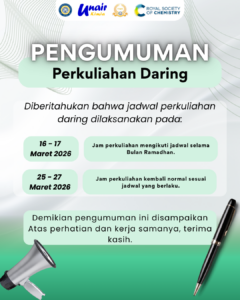The Undergraduate Chemistry Study Program of Universitas Airlangga is committed to delivering excellence in higher education through the advancement of chemical sciences, grounded in academic ethics and oriented toward addressing challenges in society and industry. Through an adaptive curriculum, research- and project-based learning approaches, and the support of competent human resources, the program strives to produce graduates with strong character, national and international competitiveness, and the capacity to make meaningful contributions to sustainable development.